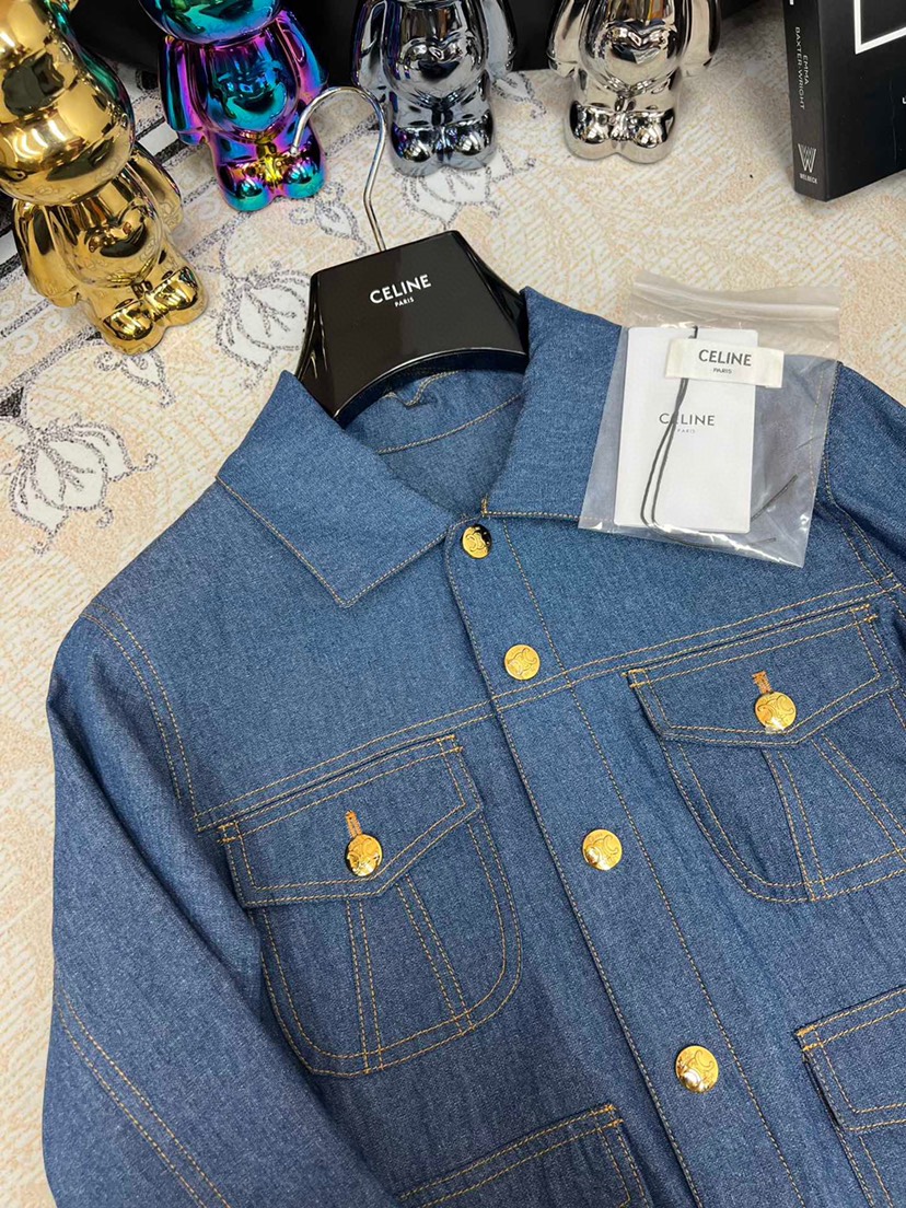 • New Celin 2023 Pre Autumn New Double Pocket Metal Buckle Thin Denim Shirt