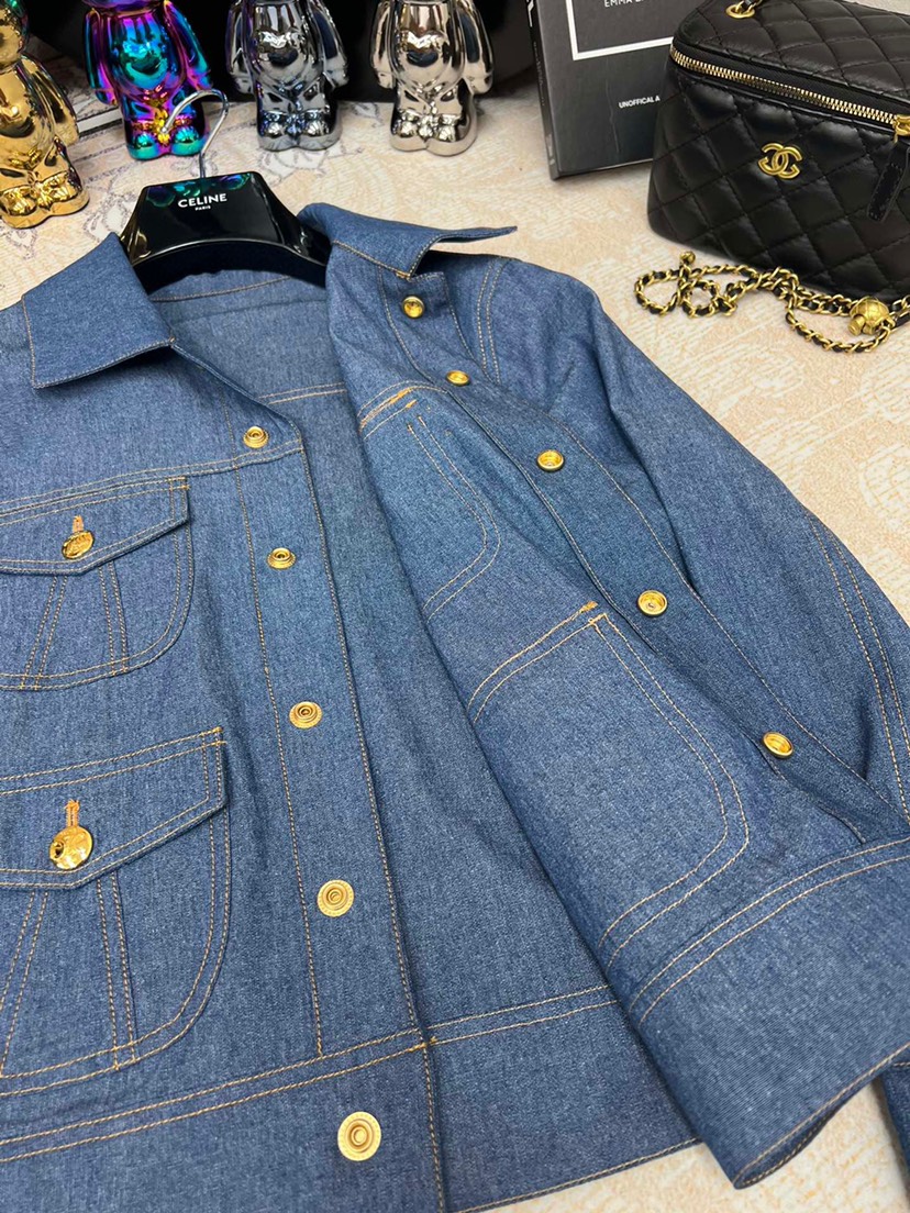 Home / Celine / New Celin 2023 Pre Autumn New Double Pocket Metal Buckle Thin Denim Shirt